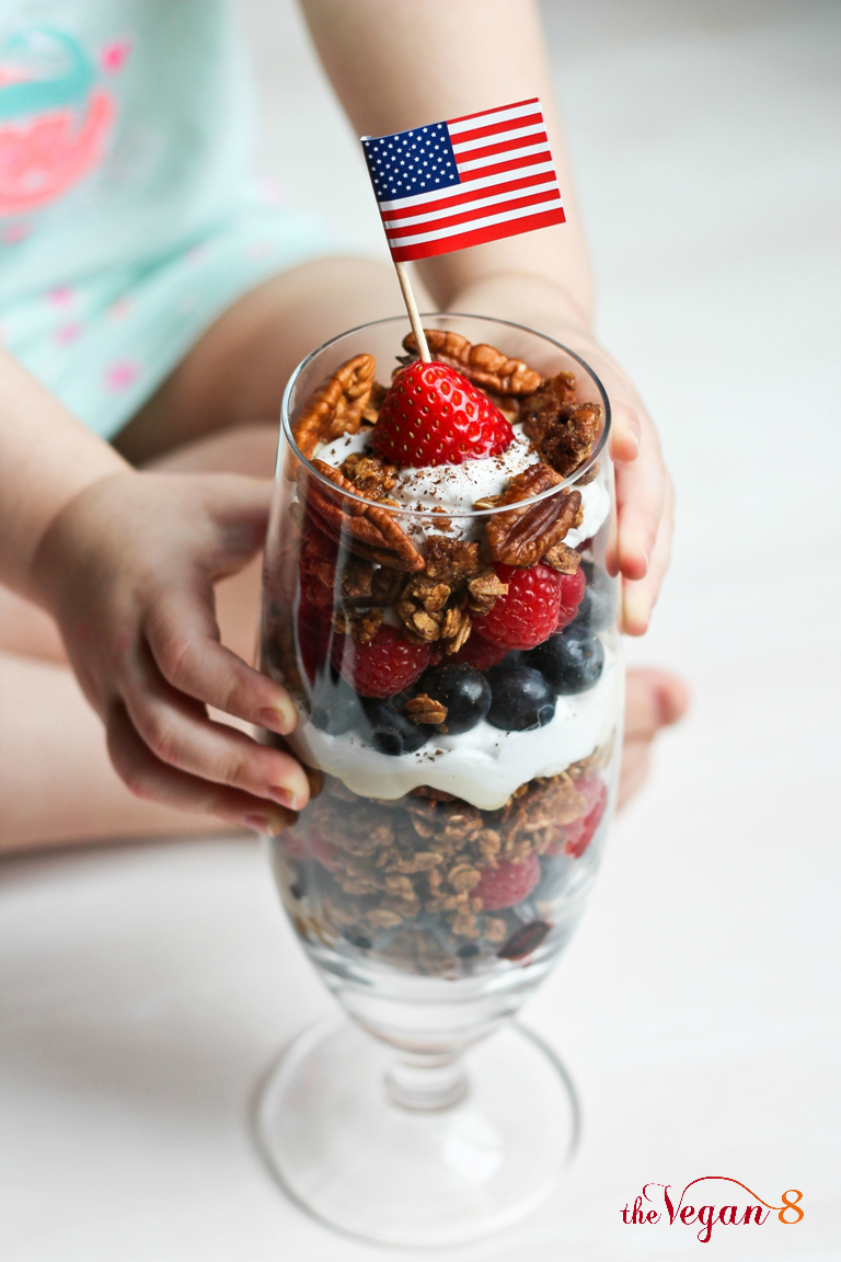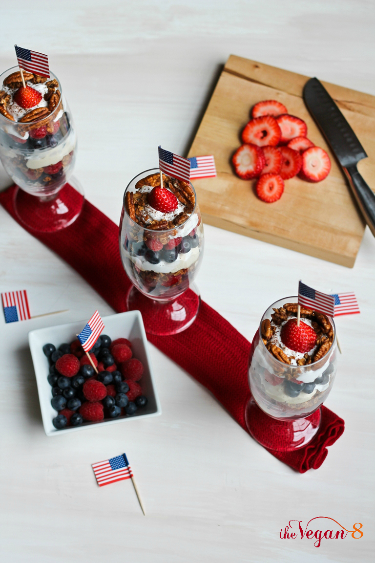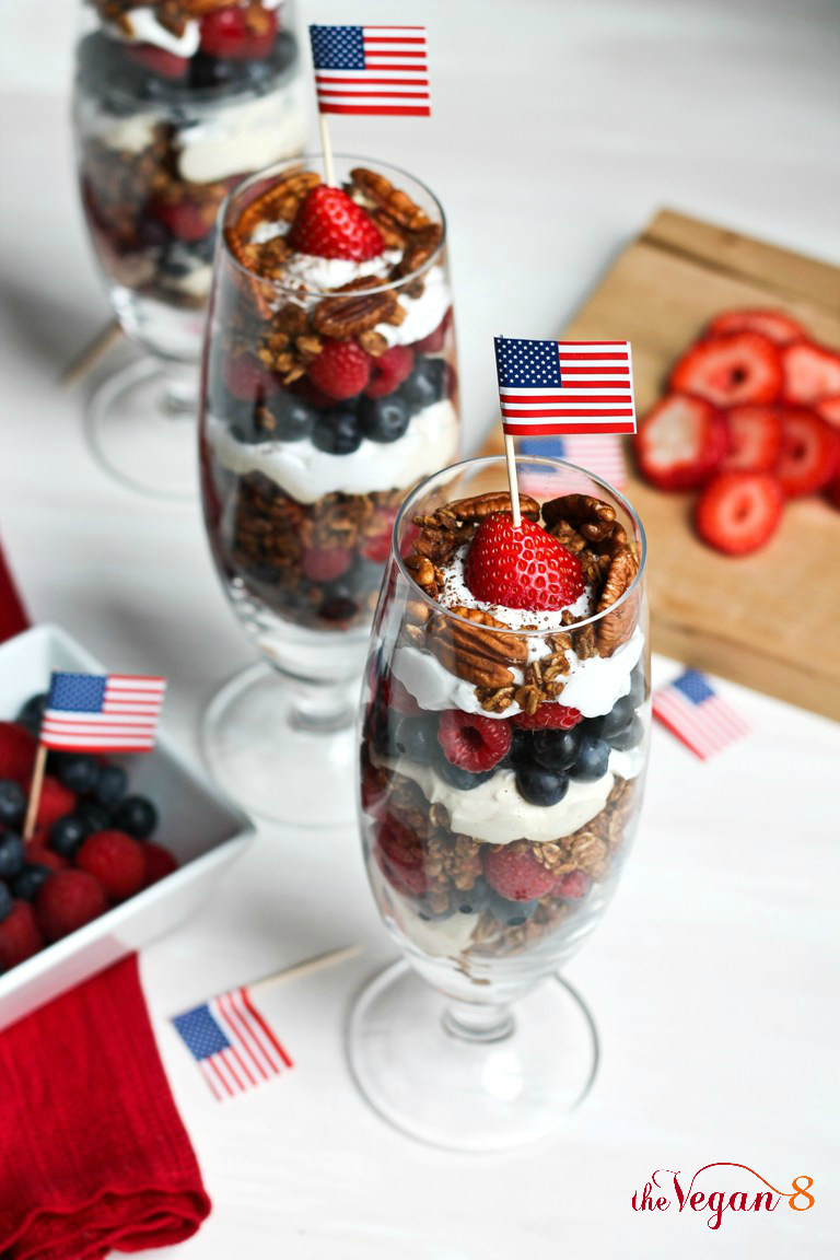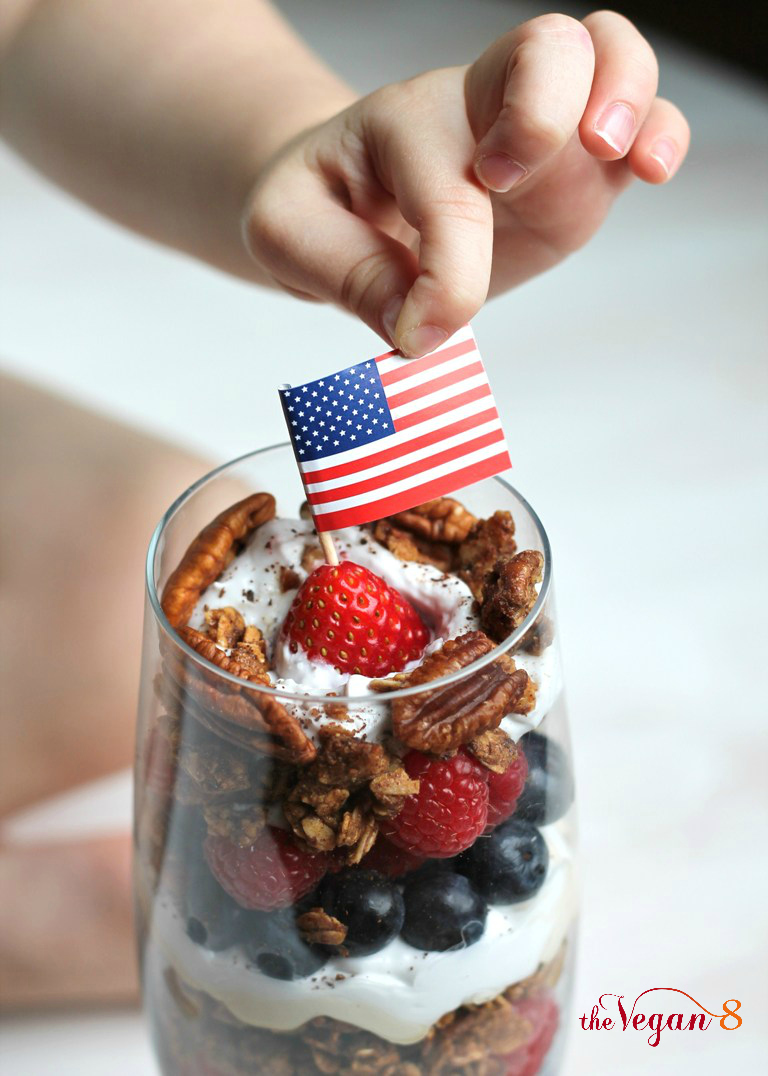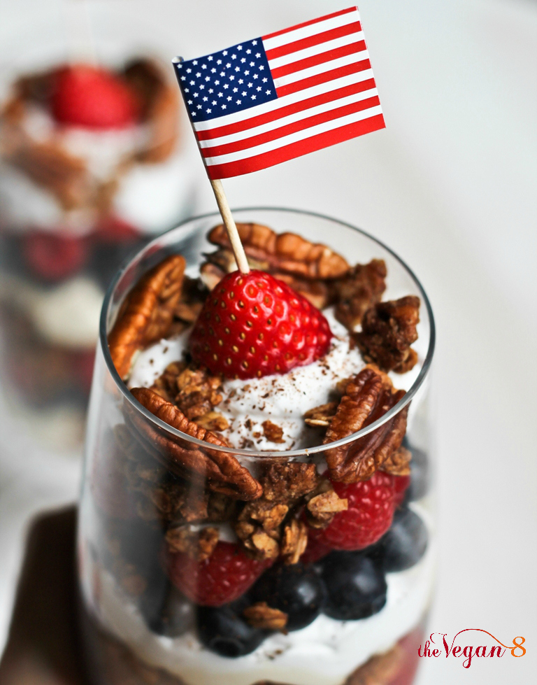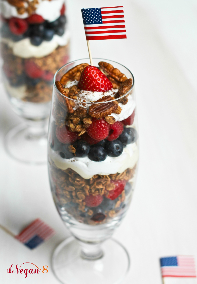 - Begin to layer your serving glasses. Start by layering the granola on the bottom, followed by a couple of spoonfuls of the coconut cream (either whipped or straight from the can), blueberries and raspberries. Repeat. Top with one more dollop of the cream and a strawberry tip (optional), sprinkled cinnamon and extra pecans. If wanting to decorate it as I have, just insert a flag into the strawberry tip. Keep in mind, the layering may vary depending on the size glasses you use. It will be delicious no matter what! These will keep fresh in the fridge up to 2 days.