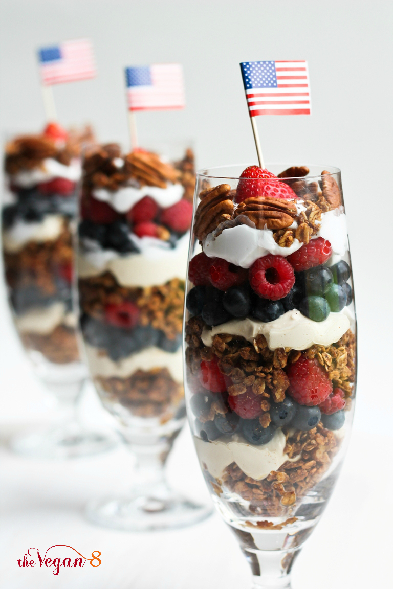 These parfaits look like the epitome of summer! I’ve been on a huge berry kick lately and the coconut cream sounds heavenly too. I’m also a big fan of the cute little flags. I love the 4th!