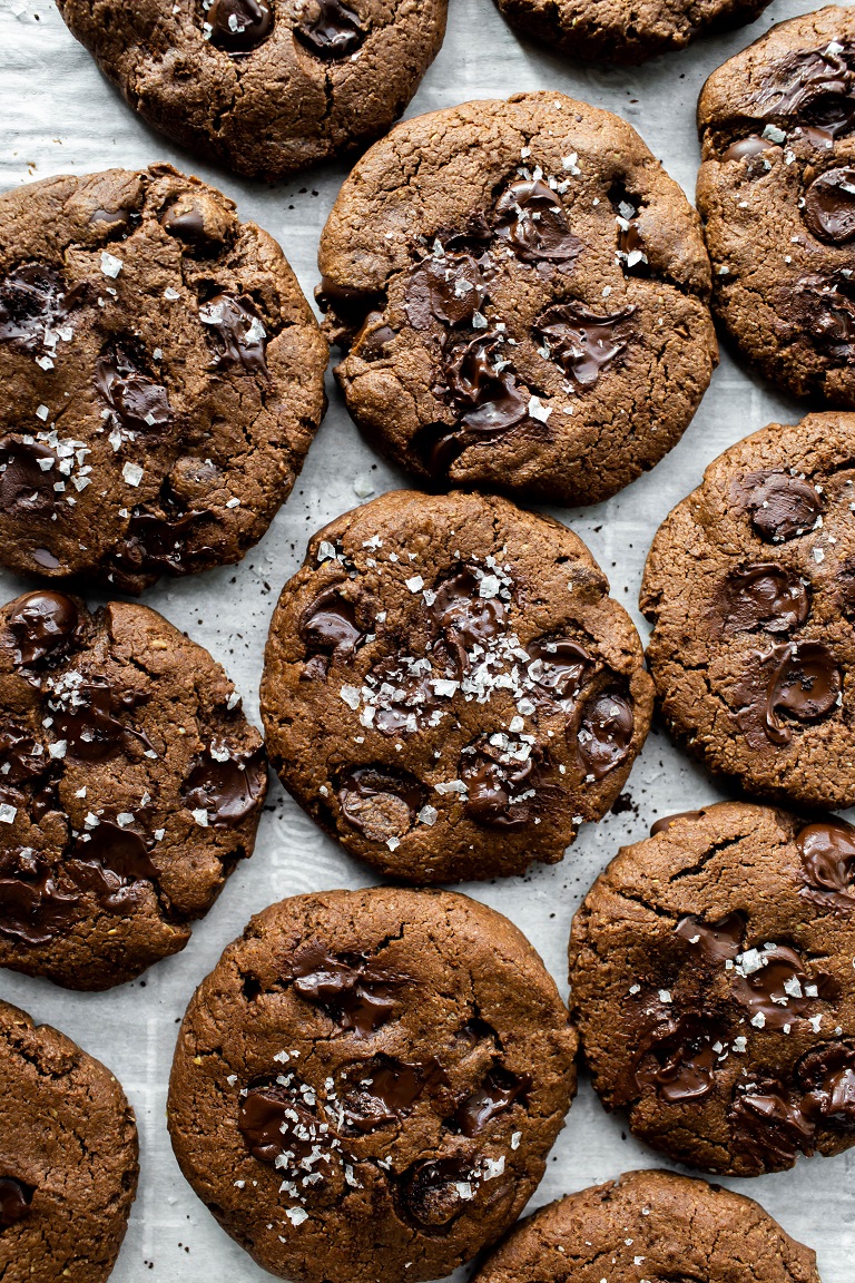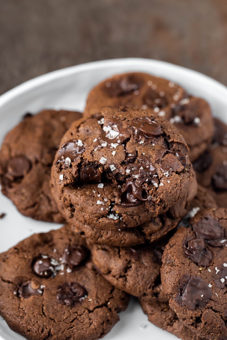 Does the sound of Vegan Gluten-free Chocolate Cookies with espresso and flaked sea salt get your mouth watering? I thought so. These vegan chocolate cookies are so delicious, fudgy, rich in chocolate flavor and next level with the espresso and sea salt sprinkled on top. The fact they are oil-free, have no wheat, no dairy and no oil or butter is shocking because they are so good and so fudgy.