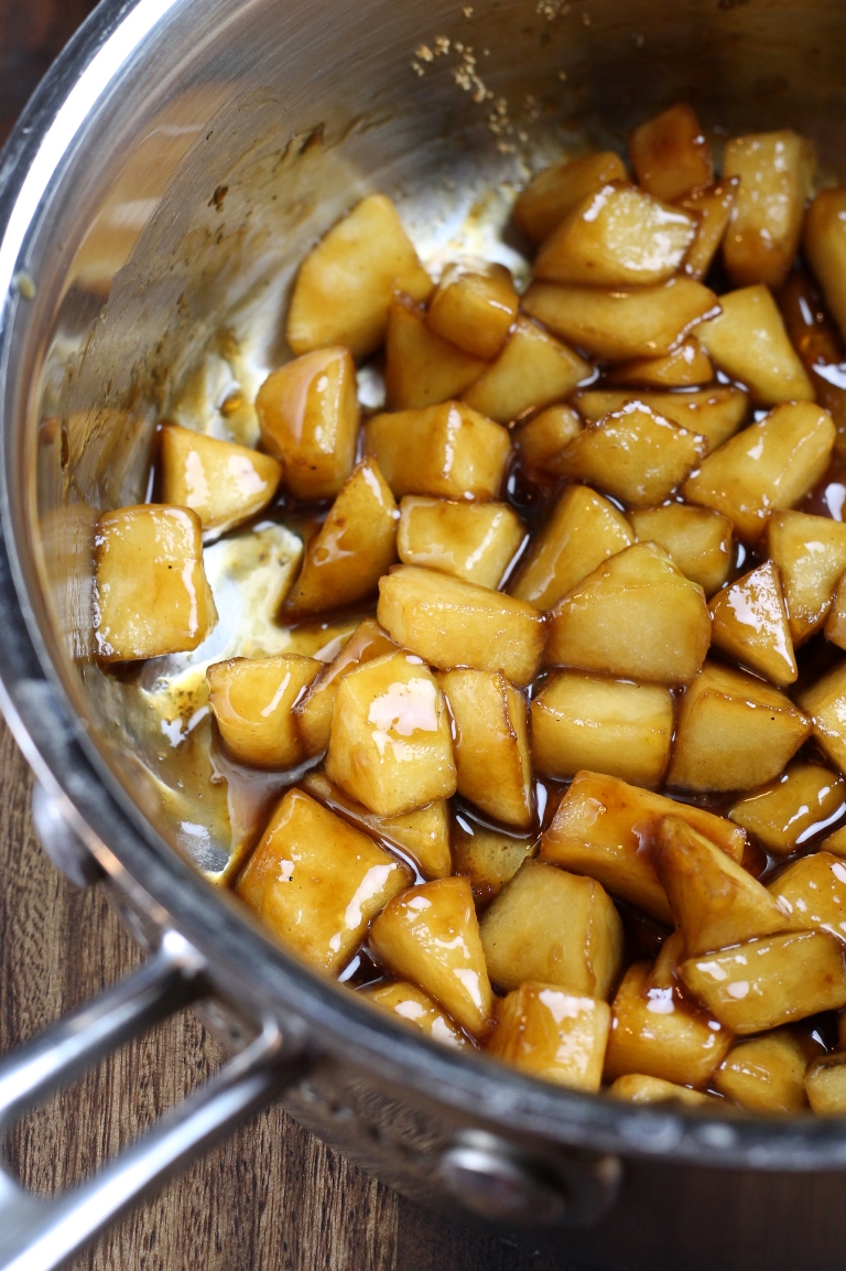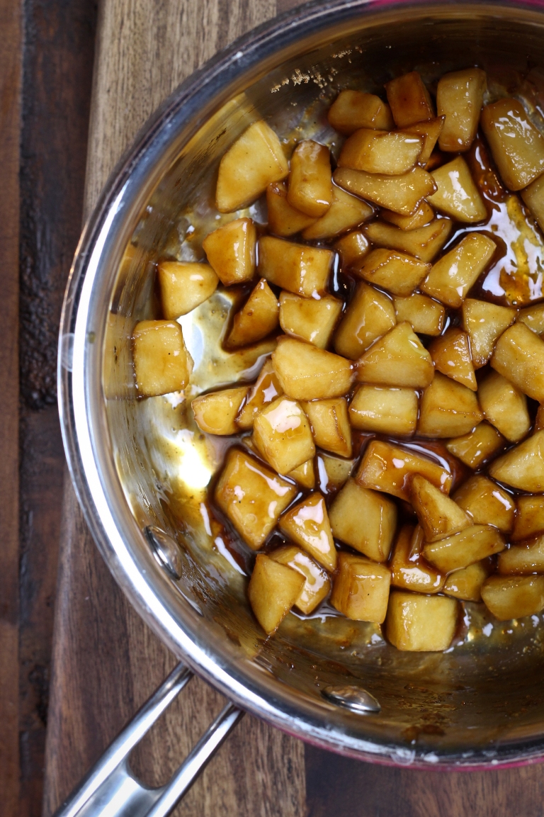 • While the dough is chilling, make your apple pie filling. Add the chopped apples, apple spice blend and coconut sugar into a small pot and stir around to coat all the apples. Add the 1 tablespoon water and stir. Turn the heat to medium. Once it starts to sizzle, immediately turn to the lowest heat, cover and let cook for just 5 minutes, just until the apples have began to soften and looking syrupy. You just want to slightly cook them, so they will be fully cooked after the oven baking step. Let the filling cool off.