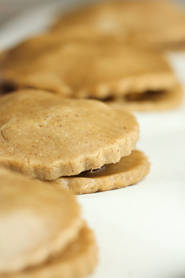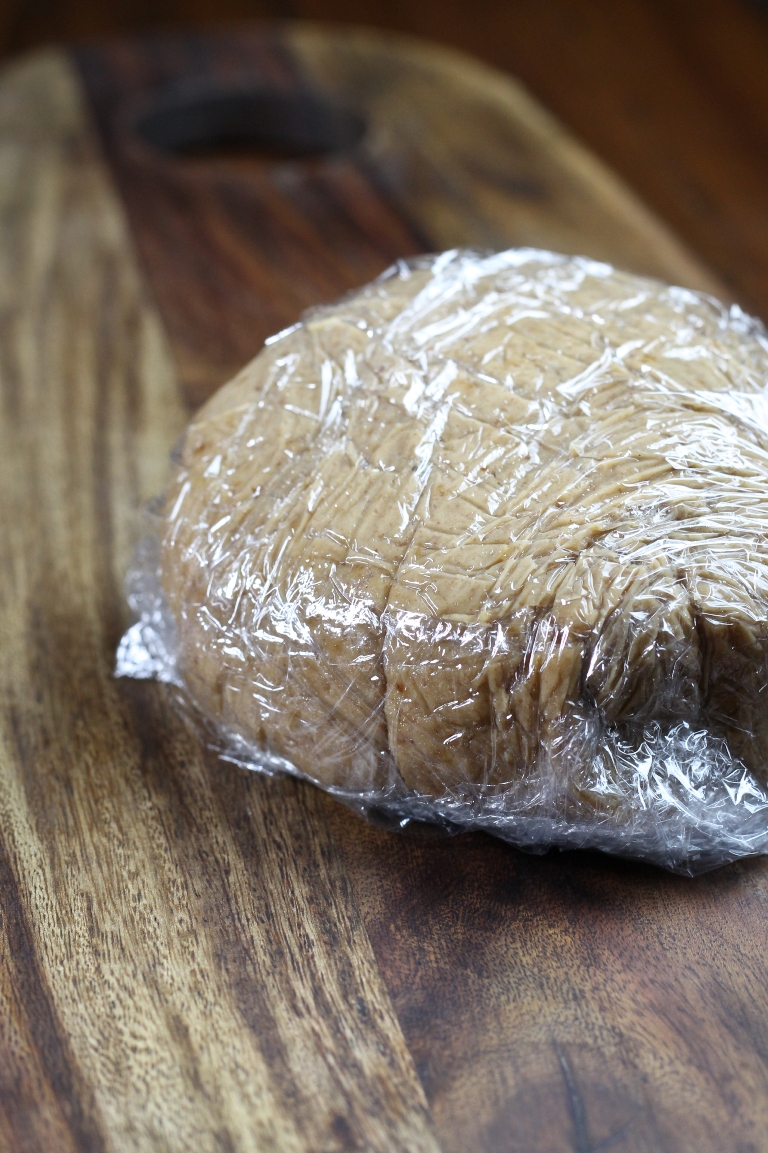 • Measure out only 1/2 cup of the pecan butter and add to the food processor, with the 6 tablespoons hot water (I warmed my water for 30 sec in the microwave) and vanilla. Process until it all comes together into a really sticky dough, resembling thick peanut butter, a few seconds. Scrape the sides and process once more. It will not be like a traditional pie dough, it will be more sticky, truly like peanut butter, but will firm up a TON in the chilling step. Do not be tempted to add extra flour! Refer to photo for texture.