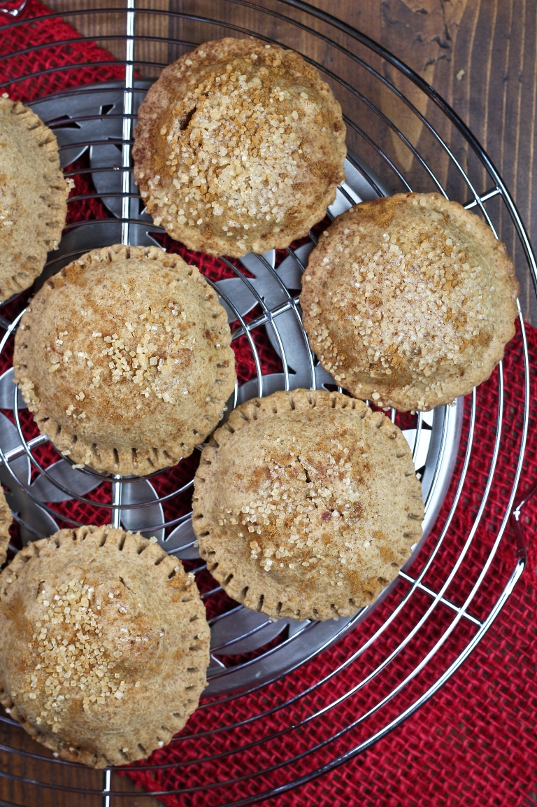 Decorate the tops. Lightly dampen a pastry brush with water and brush the tops of each pie, just to moisten them, so the sugar will stick. Sprinkle extra apple pie spice or cinnamon and raw sugar (or coconut sugar) all over the tops. Don’t be shy with the sugar. The pies themselves are mildly sweet, so this is where the nice sweet bite comes from.