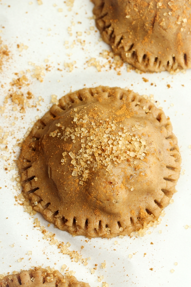 • Lightly dampen a pastry brush with water and brush the tops of each pie, just to moisten them, so the sugar will stick. Sprinkle extra apple pie spice or cinnamon and raw sugar (or coconut sugar) all over the tops. Don't be shy with the sugar. The pies themselves are mildly sweet, so this is where the nice sweet bite comes from.