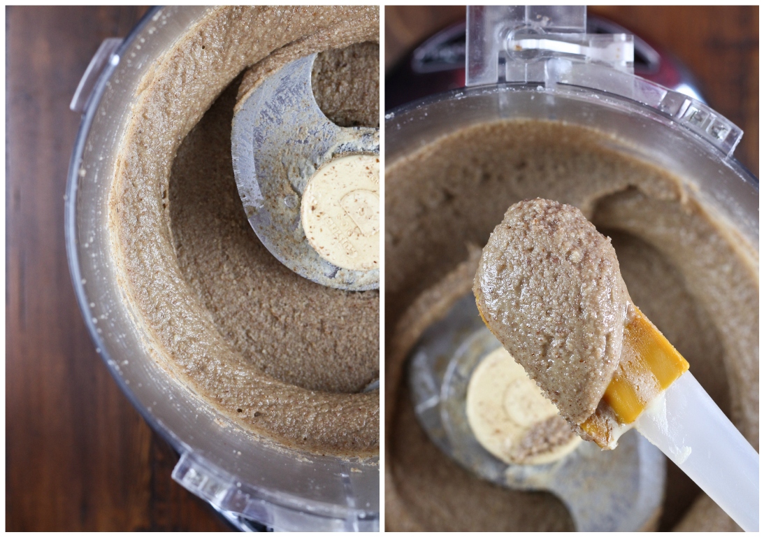 • First, make the pecan butter which only takes 10 minutes. Store-bought does not work, it's too oily. Use raw pecans and not roasted, because the roasted are too oily. Add 2 cups raw pecans to a food processor and process into a flour. Scrape down the sides and process for about 10 minutes until it is very, very smooth and creamy. You will need to scrape down the sides a couple of times during. Do not stop processing once it is a paste, you need to keep going until it is very soft and smooth and the consistency of a soft buttercream frosting. It should be smoother than almond butter, more oily. If it's not oily enough, then it won't blend properly with the flours! You will have extra, but will only need 1/2 cup for the dough.
