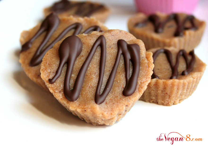 • Press into 12 silicone molds (I got mine from Michael's) or foil liners. Press firm and flat and around the edges. These are plenty delicious on their own, but if you want a more dessert style presentation, add the chocolate drizzle. Just melt the cocoa butter, add the agave and cocoa powder and whisk with a fork. Drizzle with a spoon or pour in a plastic ziplock bag and cut off the corner to make a small opening to pipe it out. You can make more strategic drizzles this way.
