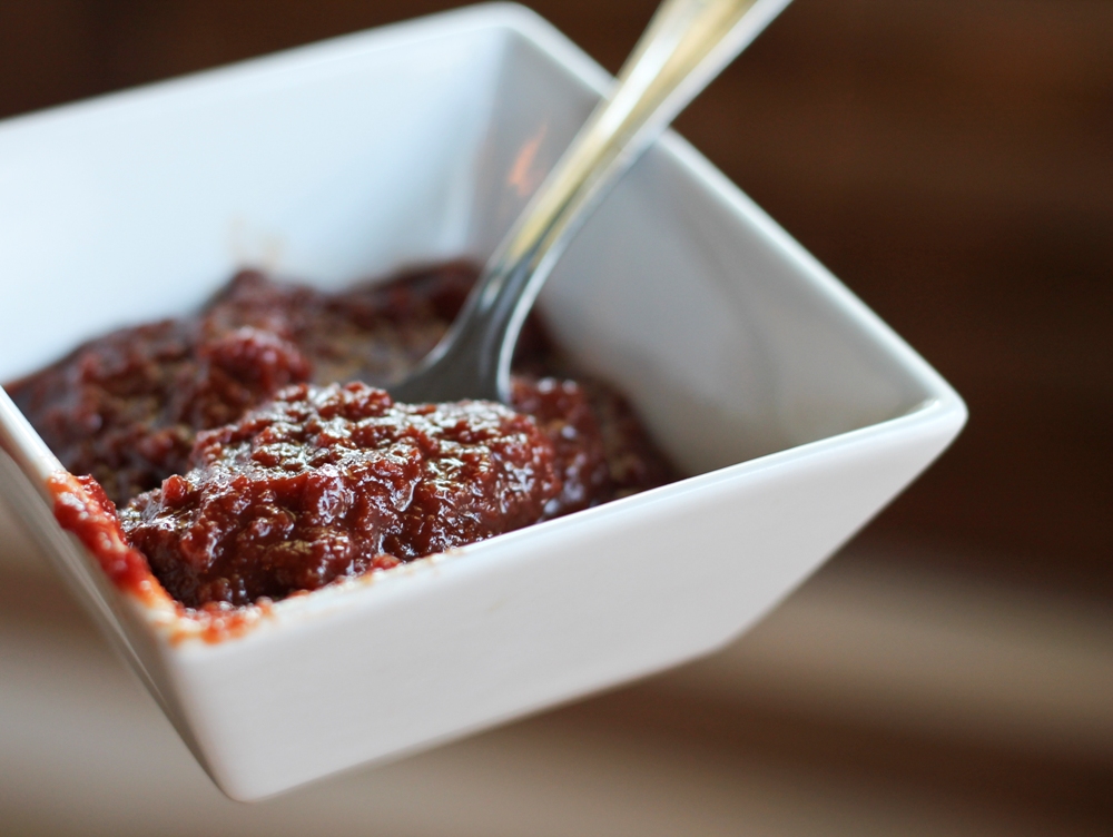 • You can prepare it the day before making the chocolate if you like. Add the cherry jam ingredients to a food processor and just enough lukewarm water to blend until the mixture becomes very smooth and all the cherries are broken up, but the jam is still thick (like in the photo). I used 4 tablespoons of water. Really blend it for a few minutes until it gets smooth, scraping the sides as necessary. Depending on which dried cherry brand you use, the sweetener may need to be adjusted. Mine were already sweet, so 1 tablespoon of syrup was perfect. You will have lots of jam leftover, which is a great thing, you can make more chocolates or use it on toast, muffins, pancakes, etc. We have been using it on toast and English muffins.