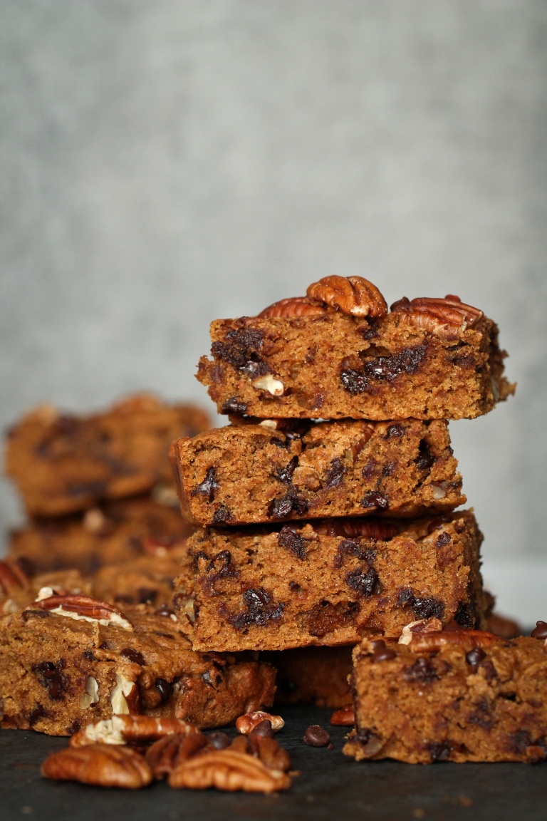 I also made these Pecan Coconut Chocolate Chip Bars (pg. 183) during the day, so I got photos this time, haha. Kathy offers an oil-free version, so I subbed the oil for half and half of pumpkin and almond butter. Because of using less fat, I didn’t want them to turn out too cakey or dry, which happens with lower fat baked goods, so I undercooked them a few minutes. I removed them at 18 minutes and they were perfect. I loved the addition of the pecans, being my favorite nut and all!
