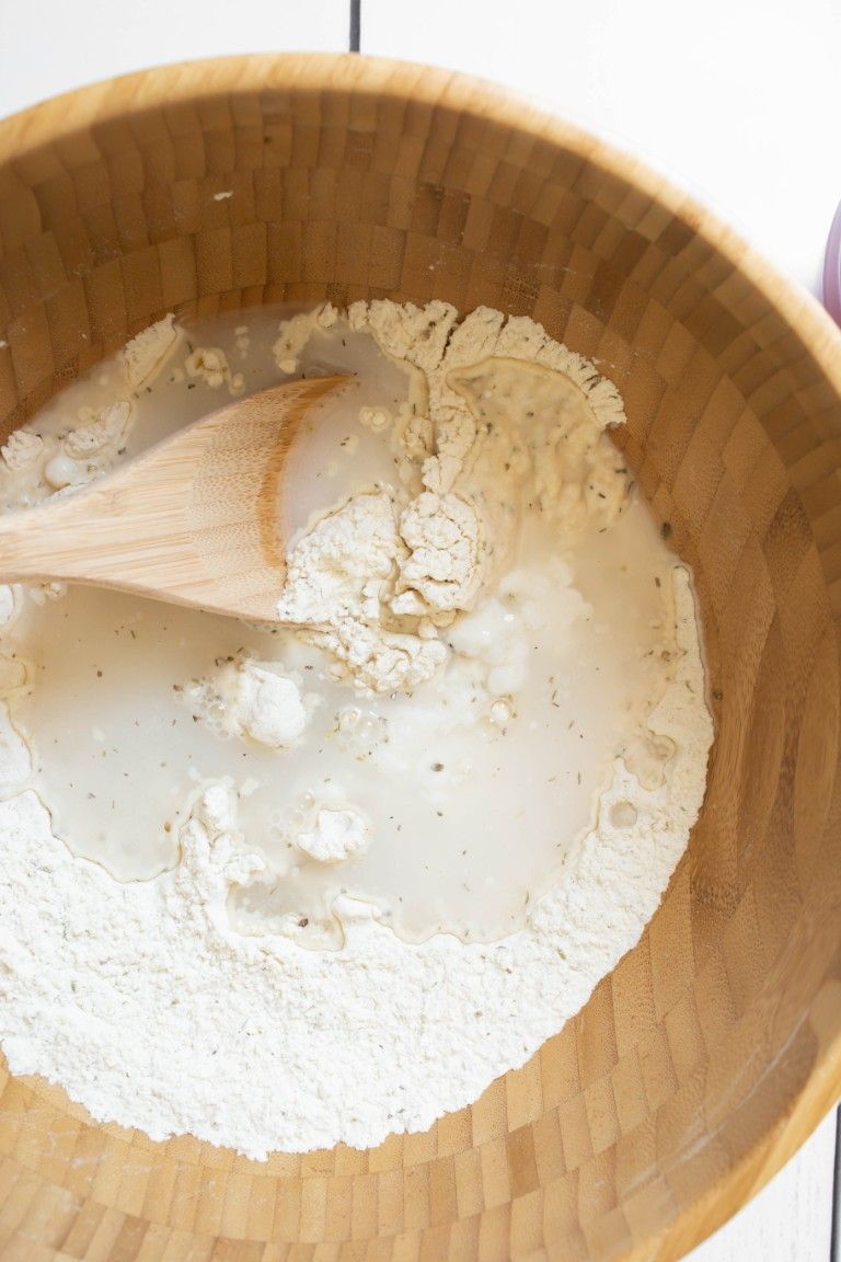 - To a large bowl, add the flour, baking powder, garlic powder, Italian seasoning and salt. Whisk very well until thoroughly blended.