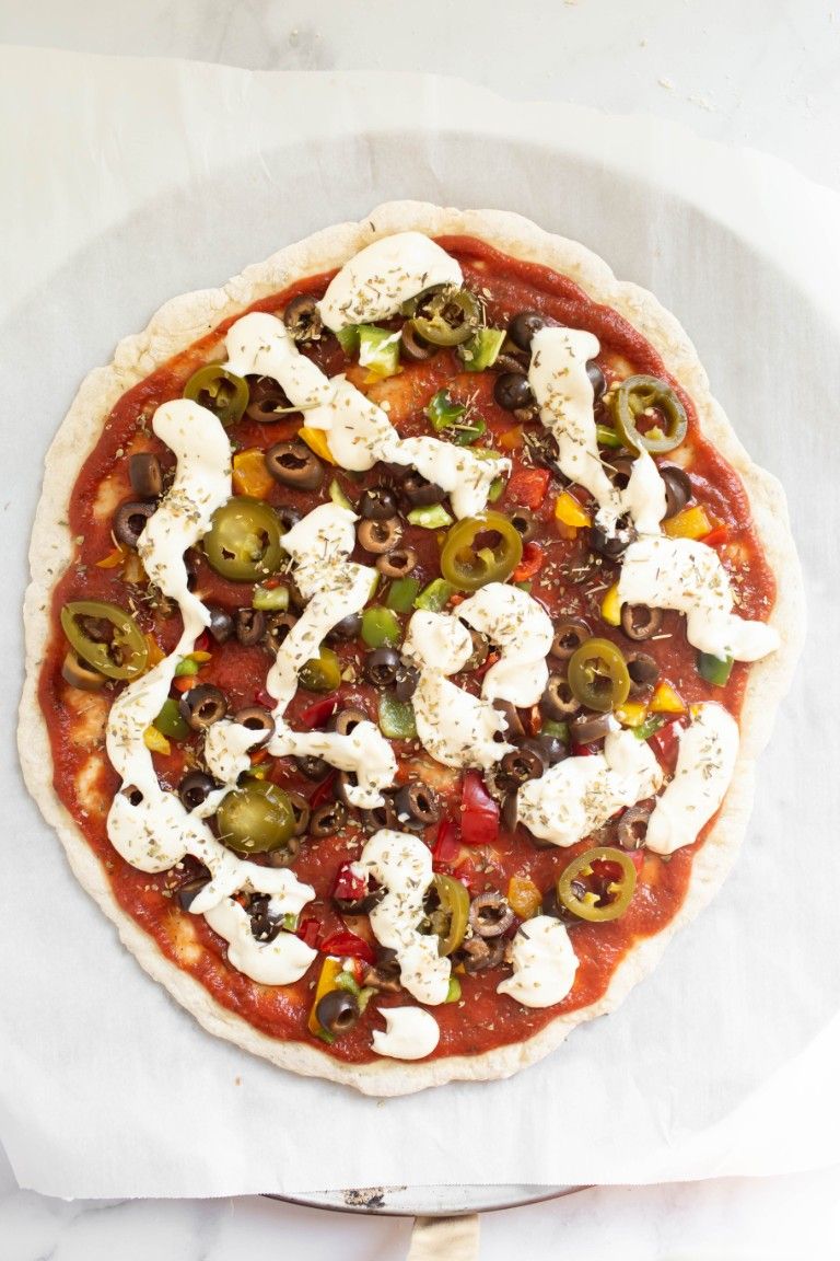 - Add any toppings of choice. My favorite toppings are to add my homemade pizza sauce spread out generously right up the edge with a small gap as pictured. Add lots of diced bell peppers, sliced olives, sliced pickled jalapenos and then huge dollops and drizzles of my vegan mozzarella and a generous sprinkling of my Italian seasoning all over!