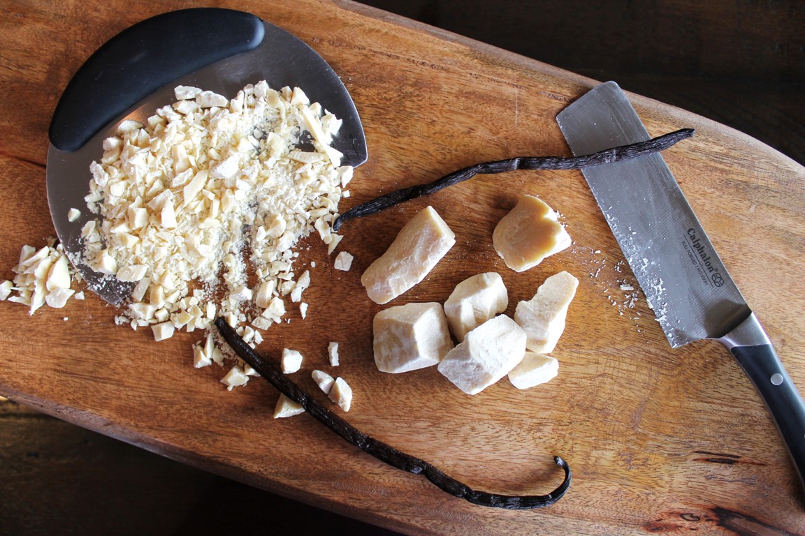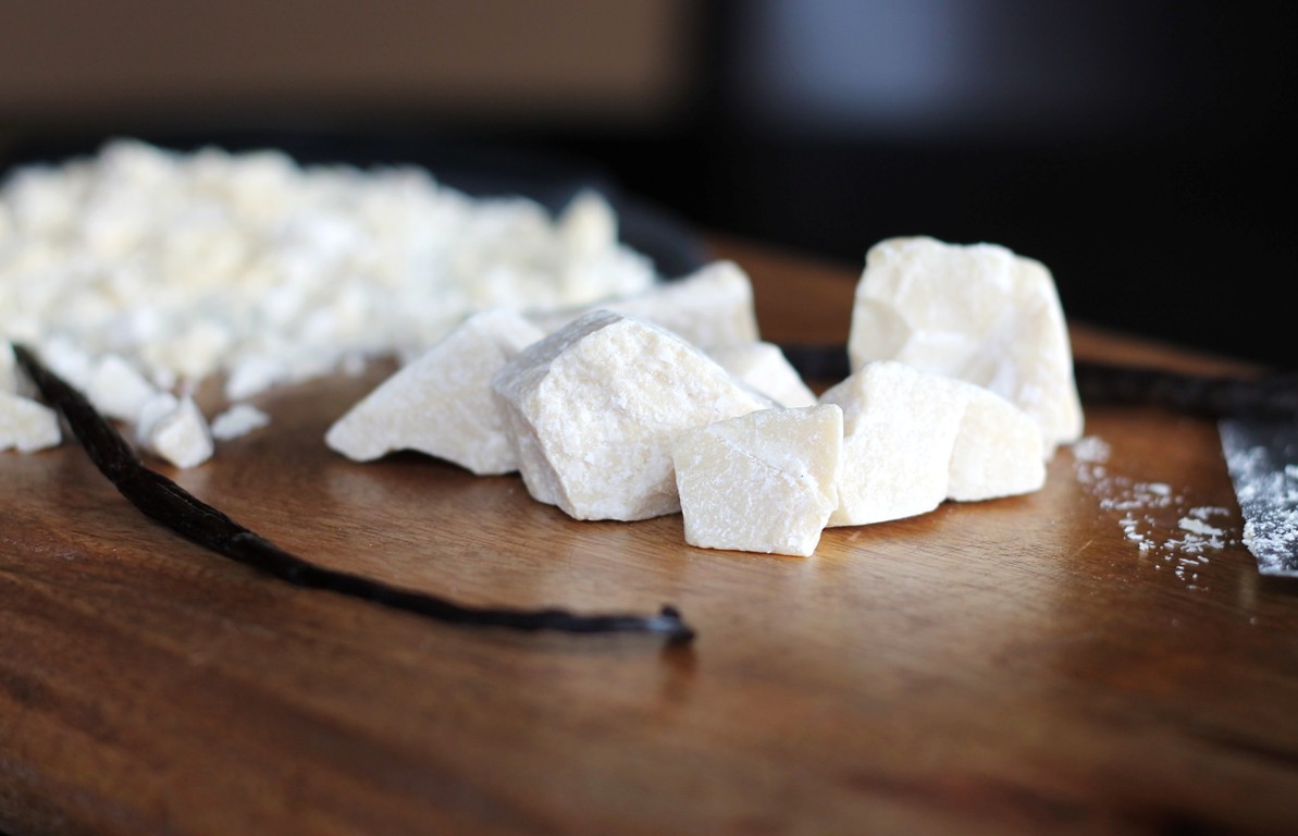 This Vegan White Chocolate Vanilla Bean Ice Cream has a strong vanilla flavor with white chocolate undertones. I achieved this flavor by adding raw cocoa butter. I bought a tub of it a couple months back and finally got around to using it. Real white chocolate uses cocoa butter, it has a much deeper and smoother flavor. The stuff in the stores is typically just sugar, nasty oils and fake vanilla. It’s pretty gross….think cheaper brands or Wilton candy melts. If you want to buy white chocolate, make sure it contains cocoa butter, which is the fat from the cocoa bean that gives chocolate it’s amazing flavor and smell.